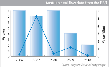 The Austrian private equity market was seriously affected by the economic crisis. Total buyout deal value fell from €5.2bn in 2007 to just €101m in 2010. Meanwhile, deal volume has halved each year between 2008 and 2010.
