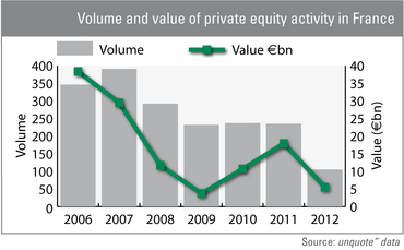 As for the French private equity industry itself, it probably could have done without the fiscal overhaul. Activity has been particularly lacklustre so far this year: nine months in, the 105 transactions worth an overall €5.5bn recorded by unquote" don't bode well compared to 2011's year-end figures (see chart below). AFIC's Godron warns that this could just be the start: "The industry, already impacted by the downturn, will collapse in France should these measures take effect."