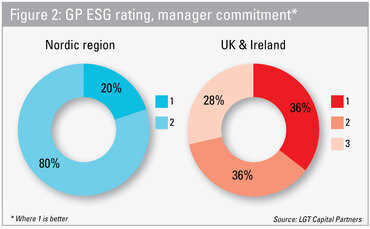 LGT also ranks managers' commitment to ESG, in terms of the extent to which GPs have adopted a robust ESG policy, employ dedicated individuals or teams and whether the firm has embraced ESG as part of its culture. Nordic GPs lead the rankings in terms of commitment, with 20% in category 1 and 80% in category 2 – compared to the UK & Ireland's 36% in category 1, 36% in category 2 and 28% in category 3 (see figure 2). This shows that, while managers in the UK & Ireland rate slightly higher overall, Nordic managers as a whole appear to have embraced ESG to a larger extent.