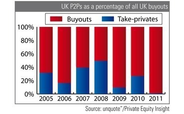 Any drop-off in P2P activity may go unnoticed, since numbers have already been on the wane since 2009. Following a 2008 peak, 2009 saw take-privates account for just 9% of deal value in the UK. The figure picked up in 2010, with just over a quarter of value accounted for by P2Ps, but this year it is a paltry 1%.