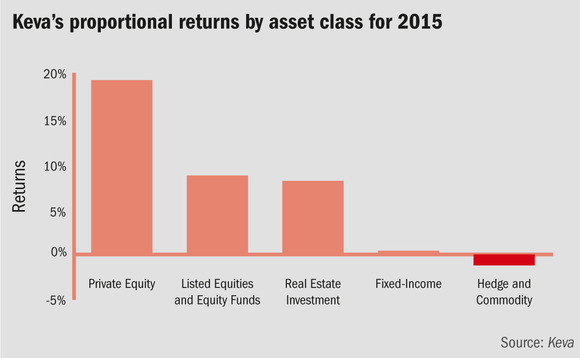 Keva's CIO for alternative investments, Markus Pauli, leads a seven-strong alternatives team, which manages a portfolio of assets worth more than €6bn across buyouts, hedge funds, indirect real estate and infrastructure. Of all the asset classes that Keva invests in, including alternatives, its best result over 2015 was generated by private equity buyout funds, which returned 19.2%. At year end, the market value of the private equity and venture capital investments covered 6.1% of Keva's investment portfolio and today the portfolio value has risen close to €3bn.