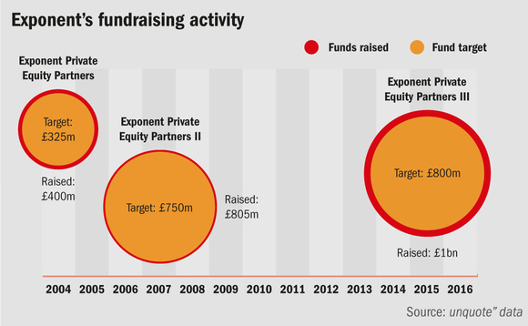 Exponent Private Equity Partners was launched in March 2004 and raised £400m, surpassing its £350m target. The vehicle is fully committed in 10 investments with a current 1.8-1.9x return and net IRR of 10%. Exponent Private Equity Partners II closed on £805m in May 2007, above the £750m target, and is fully committed in nine investments with a current 2.1x return multiple. Exponent Private Equity Partners III held a final close on £1bn in 2015, well above its £800m target. The fund has made five investments so far – Big Bus Tours, BBI, Wowcher, Racing Post and Photobox – amounting to 35% of the fund.