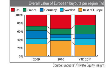 The balance of power is upset even further when looking at the combined value of all buyouts for these three countries. While the UK accounted for 33% of all European deals in value last year, this share has decreased to 24% in the first eight months of 2011. French and German contributions have risen from 14% to 22% and 8% to 11% respectively. Thanks to the three mega-buyouts mentioned above, Sweden's market share in terms of value invested has also soared from 6.7% to 15.3%.