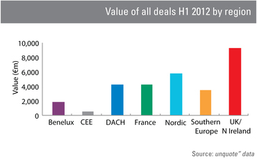 In the first six months of 2012, the UK & Ireland region saw a total of 163 deals valued at an overall €9.35bn. By contrast, France saw just 86 deals totalling €4.24bn.