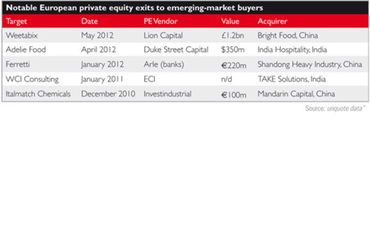 Go back 10 years, and talk of China and India centred around low-cost manufacturing. Now, unquote" has recorded six sales of European private equity-backed businesses to trade buyers in these emerging markets in the last 18 months, with Lion Capital's sale of UK cereal business Weetabix to China's Bright Food for £1.2bn the latest in Europe. That week, Indian drugmaker Piramal Healthcare bought US-based healthcare data provider Decision Resources Group from Providence Equity Partners for $635m. A month earlier, Duke Street sold Adelie Food to India Hospitality for $350m, and, in December 2010, Italy's Investindustrial reaped a 3.6x multiple when it sold Italmatch Chemicals to a Chinese investor, a few months after opening a Shanghai office.