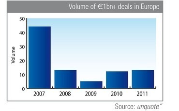 unquote" data reveals the picture is not quite as rosy as many market commentators had predicted earlier in the year. As the below graph shows, mega-buyout activity has barely increased since last year, with just 13 deals valued at over €1bn in 2011, compared to a whopping 44 in 2007 before the financial crisis hit.