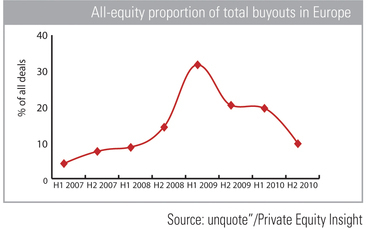 However, it seems leverage conditions are now improving, dropping to 30% in late 2009 as markets calmed and the world's major economies left recession. At the end of 2010, this has fallen even further, with all-equity transactions accounting for just 20% of deals.