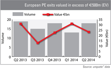 Highlighting the fact that most GPs would rather be busy with exiting boom-year investments than making new ones at this point in the cycle, large-cap divestment activity has outpaced incoming deals in recent weeks. Unquote" has so far recorded 18 exits valued at more than €500m since April this year, up from 13 in Q1. However, overall value took a dip from €31bn to €23.3bn, although Q1 figures were somewhat skewed by the hefty €7.2bn sale of Grupo Corporativo Ono and the $7bn flotation of King Digital.