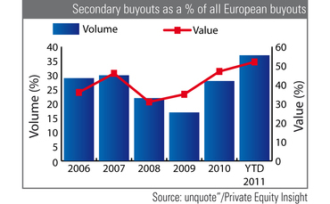Secondary buyouts are back in a big way, accounting for the majority of activity in Europe, and as much as two thirds of market value in the UK and France, according to unquote" research.