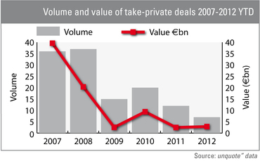 As the stock market recovered following 2009, PIPE deals have tailed off, but the economy remains depressed, and as such there have been few significant take-privates as firms continue to struggle to raise the sort of financing needed to take major listed companies off the market.