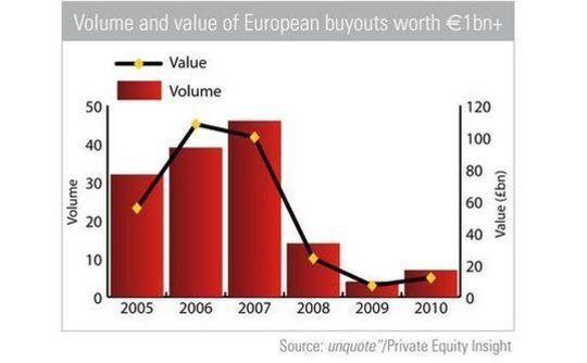 So far, 2010 has seen a total of seven buyouts valued at over €1bn, with a total value of almost €12bn. This compares favourably with 2009, when there were just four large buyouts, with a combined value of €7bn. With other large buyouts rumoured to be in the pipeline, 2010 could see more than double the activity of 2009 by year end.