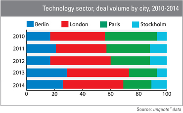 During this time, Berlin outpaced Paris as the second most popular European city for private equity deals in the technology sector. The German capital recorded an impressive growth of 313%, from 16 tech transactions in 2010 to 50 in 2014. By comparison, Paris's technology sector grew marginally – from 36 to 38 deals. As a result, Berlin accounted for 26% of the total number of tech deals between the four cities at the end of 2014, up from 17% in 2010, whereas the French capital's share declined from 38% to 20%.