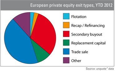 As a result of these improved activity levels, trade sales represent nearly 45% of all European exits so far in 2012 (see chart below). This is a notable improvement on last year's 37% and actually higher than the 42% witnessed over a 10-year period between 2000 and 2010 by unquote".