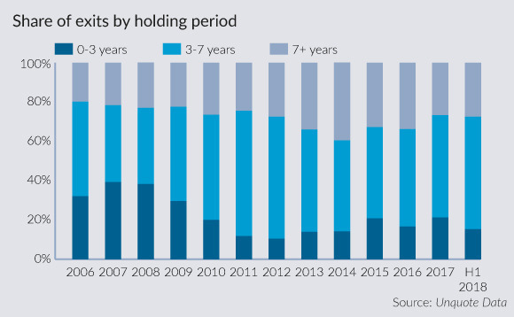 Long holds – buyouts exited after seven years – accounted for 28% of exited buyouts in the first half of 2018, a far cry from 2014's 40% but still higher than pre-crisis rates of around 20%.