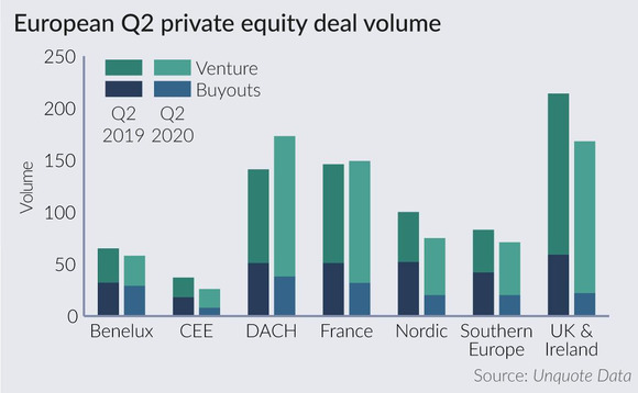 Not all European buyout markets were affected equally by coronavirus lockdowns in Q2, with DACH emerging as the busiest region while its neighbours saw little activity, according to Unquote Data.