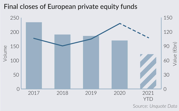 That said, this year's aggregate commitment total illustrates the continued bifurcation at play in the market. This record amount was raised across 121 funds, the exact same number of vehicles closed in the first nine months of 2020. As a result, the average size of funds closed in 2021 stands at EUR 872m, against EUR 729m in the comparable period in 2020. By comparison, this average size stood at EUR 474m in the first nine months of 2018.