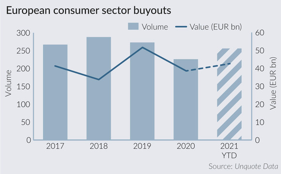 The consumer sector saw healthy amounts of inbound private equity interest in the third quarter of 2021, while more on-trend verticals such as technology and healthcare took a backseat, Unquote Data shows.