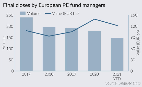While the aggregate commitments secured by European private equity managers so far in 2021 are already nearing the previous record set last year, the number of vehicles that reached a final close is on track to be the lowest in years, according to Unquote Data. Greg Gille reports