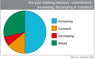 It seems that despite talk of reduced commitments, allocations are actually increasing in size and so perhaps decreasing in number, indicating increased selectivity. Almost half of surveyed GPs (46%) said LPs were increasing their commitments, while only 5% admitted a decrease in investment mandates (see chart above). That explains the significant number of funds noticing an increase in commitments, as well as unquote" reporting so many funds closing 'above target' and 'in record time', as only the top GPs are able to close in this climate. Again, it stresses the importance of relationship management paired with fund management skills.